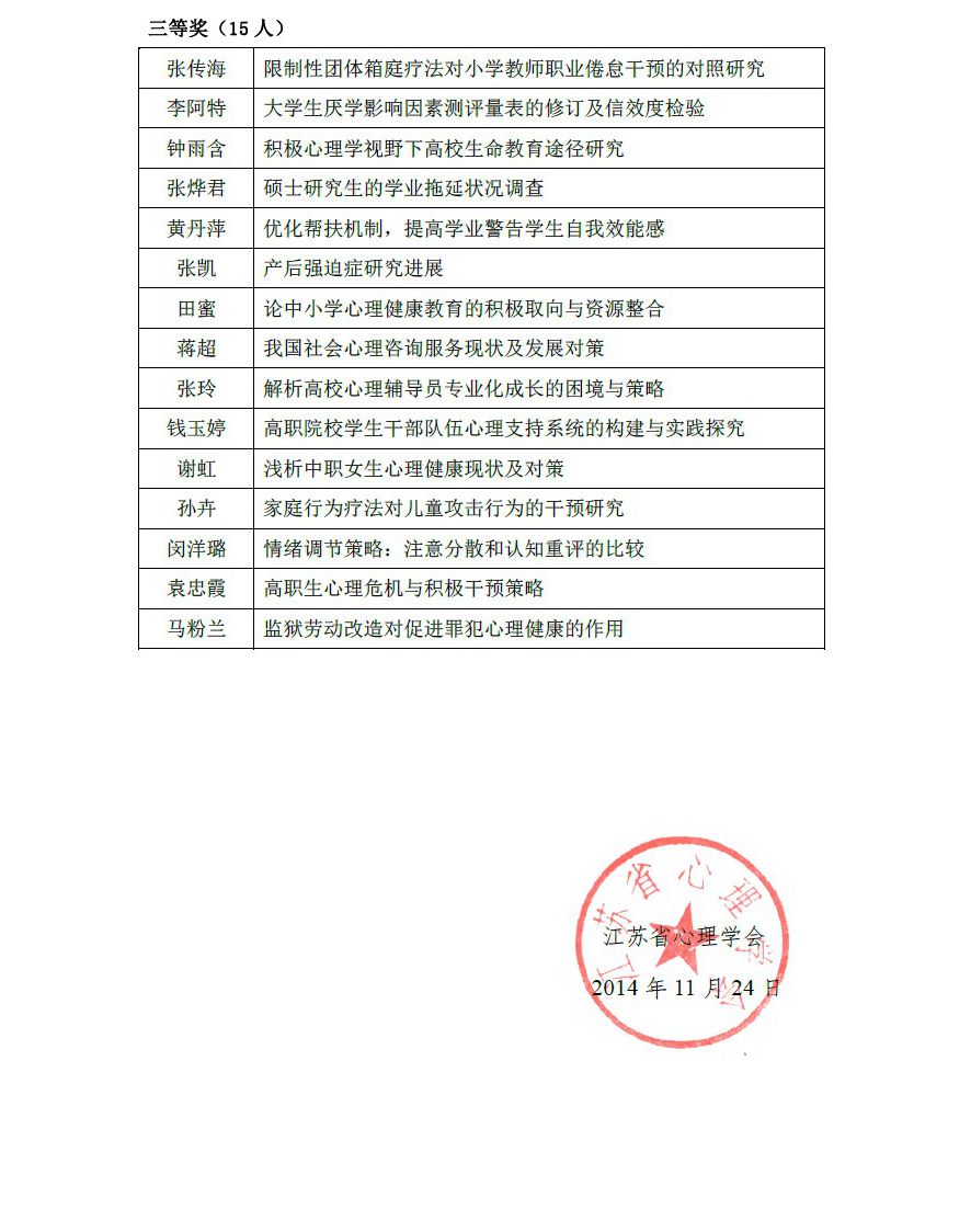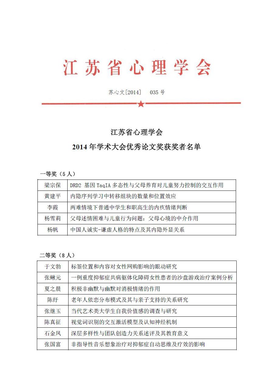 江苏省心理学会2014年学术大会优秀论文奖获奖者名单