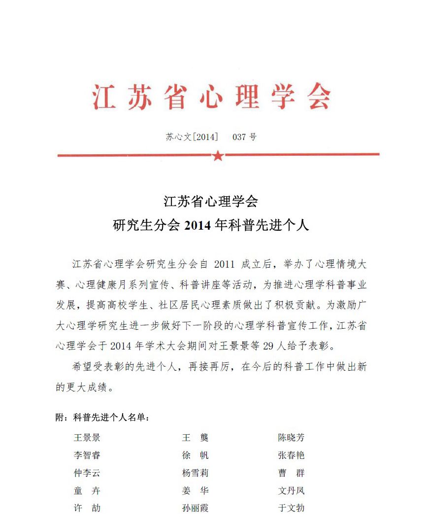 江苏省心理学会研究生分会2014年科普先进个人