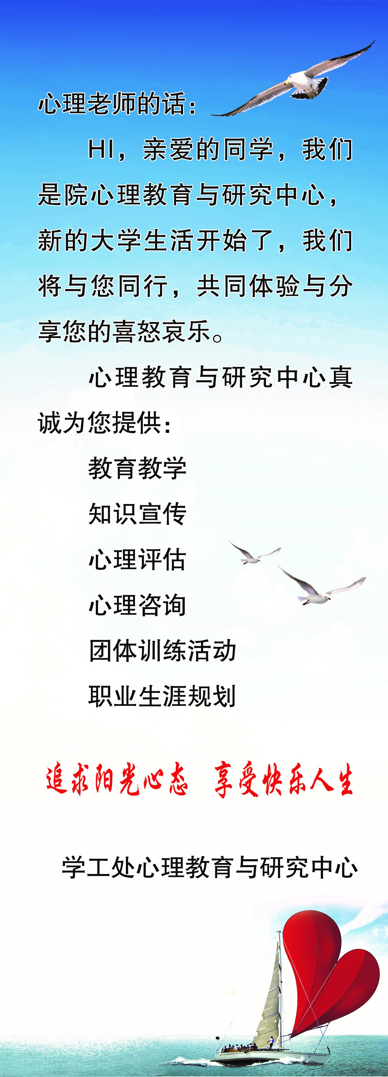为加强2015级新生之间的相互了解,增强班集体的团队凝聚力,尽快适应大学生活,院学工处心理教育与研究中心正式启动学院“新生助跑六个一”工程,即发放一张心语卡、聆听一场心理教育讲座、参加一次团体心理辅导、开展一次心理健康普测、建立一份心理档案、观看一部心理健康教育影片。