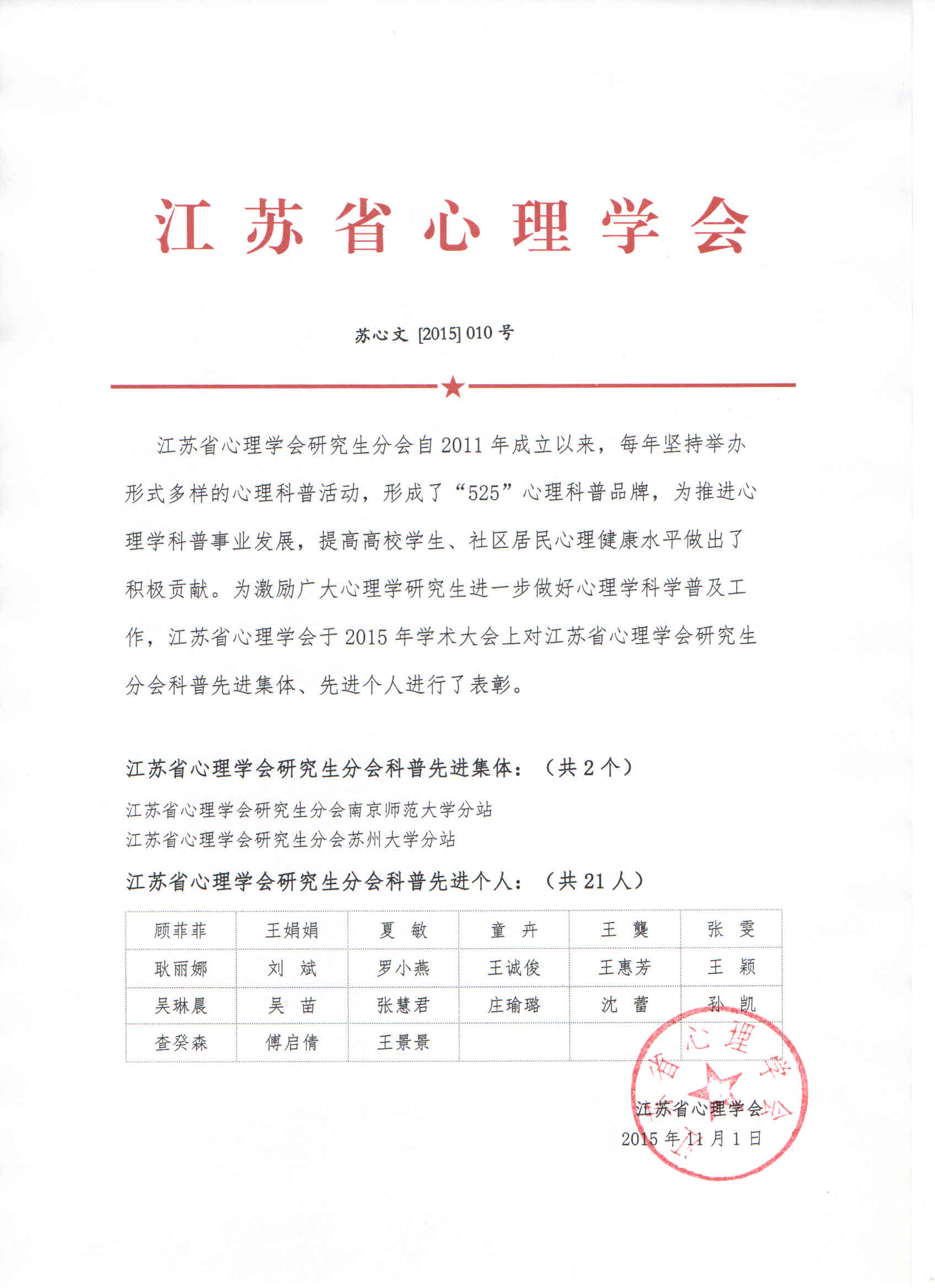 江苏省心理学会研究生分会2015年科普先进集体、先进个人表彰名单