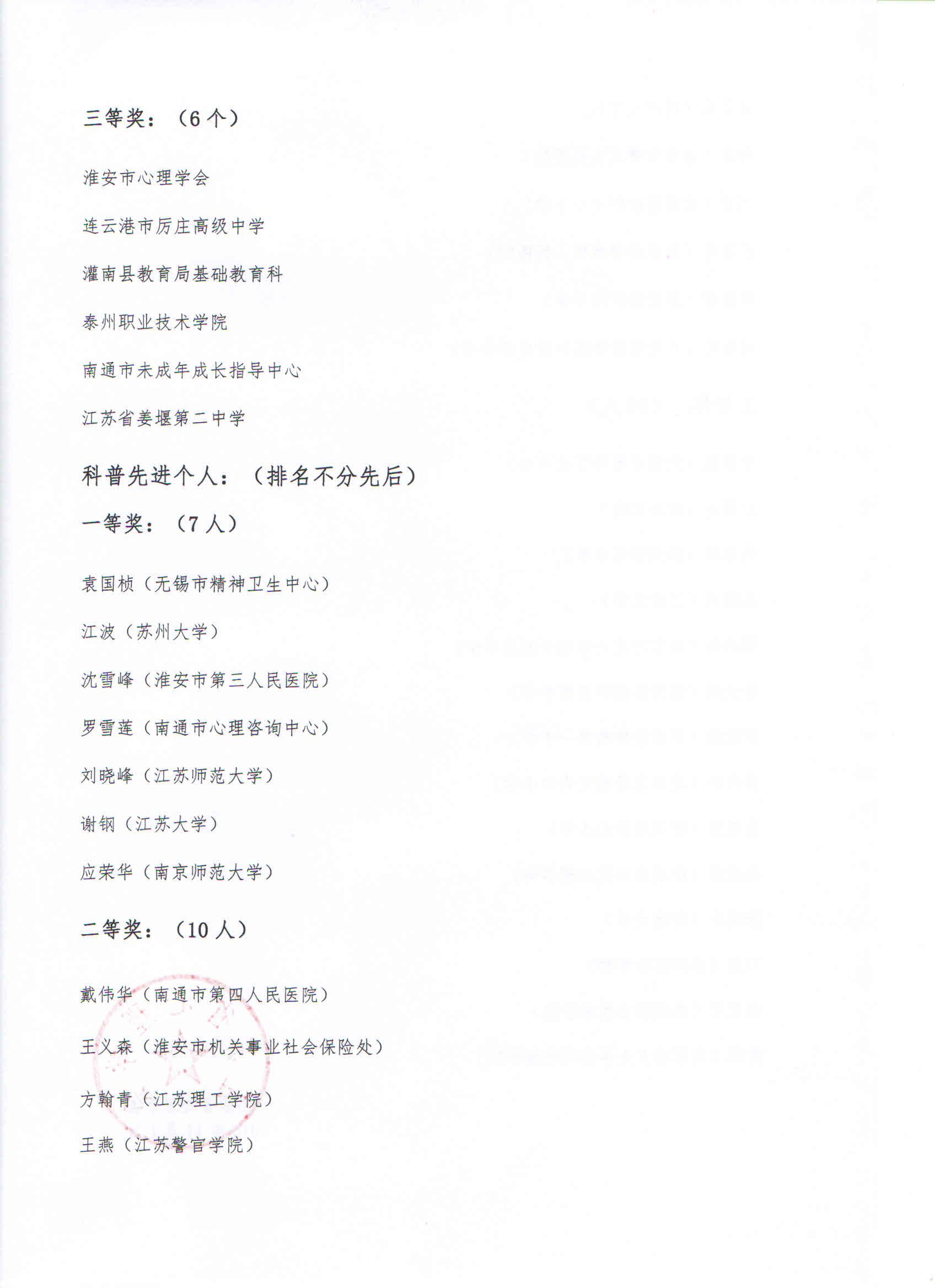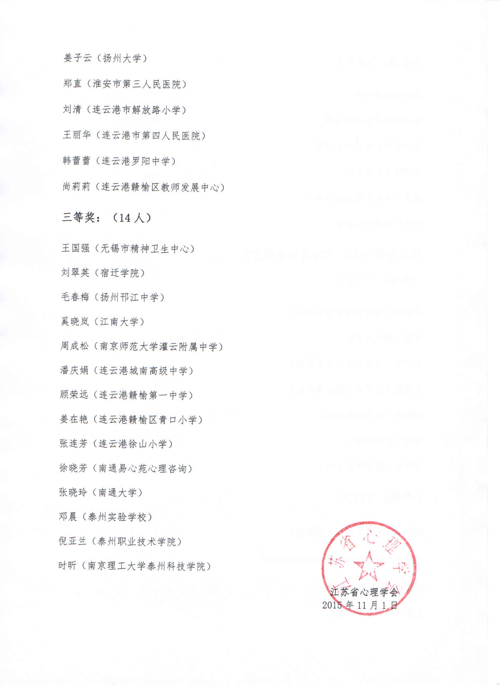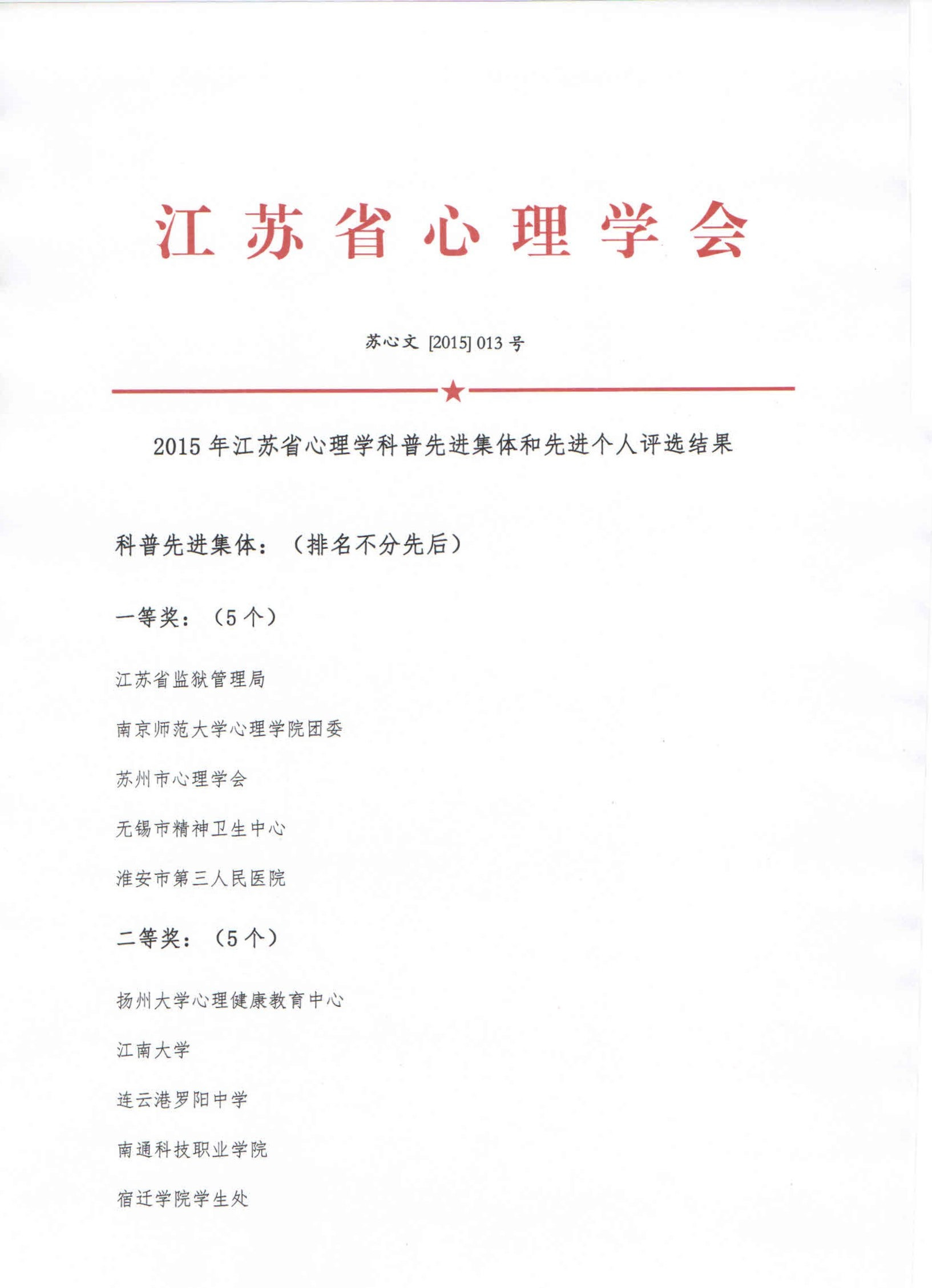 2015年江苏省心理学科普先进集体和先进个人获奖名单