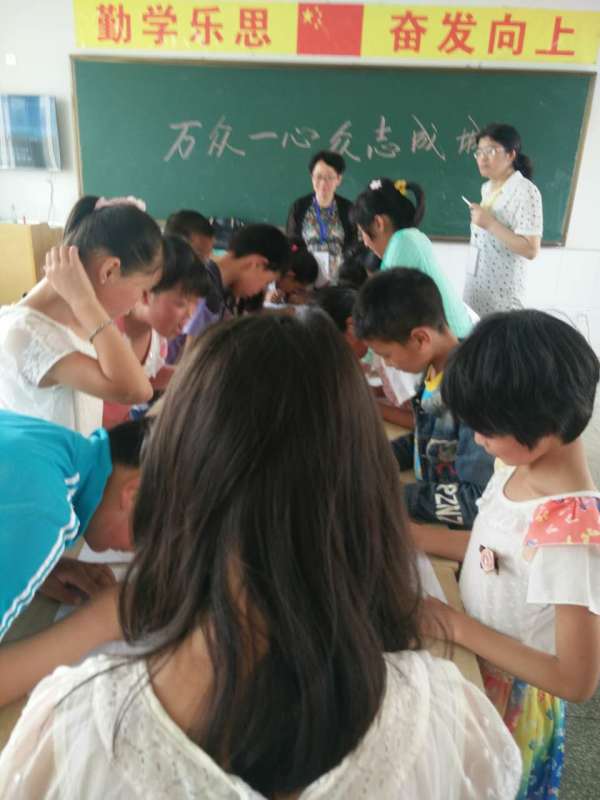 6月30日上午7时,心理援助阜宁工作站的所有人员在吴坎坎秘书长的带领下出发前去此次受灾情况较为严重的新沟镇南湾小学。车队接近南湾区域时,满目疮痍。南湾小学是一所包含幼儿园的学校,共三排教室,第一排为幼儿园教室,屋顶全部被龙卷风摧毁,第二排也已损坏,无法使用,只有第三排新盖的教学楼完好无损,现被作为村民安置点。7时44分,援助队伍在该小学谢校长的引导下进入学校。援助队在初步调研中发现,到校学生100人左右,没有教室可用,学生具体情况不详。同时,因幼儿园家长领取捐赠物品后,大多带孩子回家,无法召集,援助队临时调整工作计划,将在校的49名小学生按年级分为低、中、高三组进行评估和筛查,李建军、夏倩分别负责中、高年级组的团体带领。总体上,学生心理状况较为稳定,6人左右需要立即跟进。之后,夏倩老师对该校三名教师做心理教育团体工作,其中一名老师情绪不稳定,需要咨询师跟进。