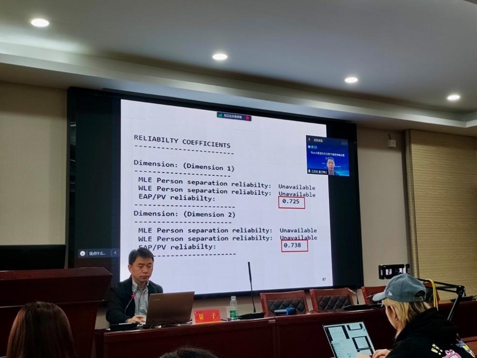 在为期两天的工作坊中,线上线下师生互动,深入学习和领略了Rasch模型的魅力。首先,晏子教授深入浅出地讲解了Rasch模型的理论基础与特点。通过比较自然科学与社会科学测量的差异,他引出了社会科学研究中测量客观性的挑战,并展示了Rasch模型如何提供解决方案。从Rasch模型的基础概念、属性探讨,到单维度与多维度Rasch模型的差异,晏子教授为听众呈现了关于Rasch模型的全面知识体系。他还分享了Rasch模型在实践中的多个应用案例,如测量工具的开发、垂直量表的构建,以及与路径分析结合的创新应用。其次,晏子教授详尽的演示了如何利用ministep软件进行单维度分析,介绍了Rasch模型分析的关键操作步骤,如数据的诊断、输出表格、以及结果图表的解析,并邀请三位学生以自己的数据进行示范,确保理论与实践的紧密结合。再次,晏子教授详细讲述了使用ConQuest软件进行多维度分析的复杂过程,不仅耐心地回答了参与者关于操作细节的疑问,强调了DIF分析的执行步骤,还点评了三位学生在数据分享和操作中的表现,解答了他们遇到的问题。工作坊的最后,教授通过讨论和答疑环节创建了一个充满活力的交流平台,鼓励线上和线下参与者提出问题,并就Rasch模型相关的疑难点进行深入探讨。