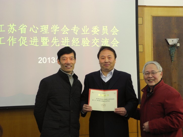 首先,理事长傅宏宣读了由理事长办公会议选举产生的江苏省心理学会2012年度优秀专业委员会名单及获奖理由。获得2012年度优秀专业委员称号的为:大学生心理专业委员会、发展与教育专业委员会和工业心理专业委员会。随后荣誉理事长郭亨杰、理事长傅宏共同为获奖专业委员会颁奖。